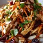 - First, grab a nice big bowl. Add your shredded chicken, the cabbage and carrots, those chewy dried cranberries, the sliced green onions, and all that fresh cilantro. Give it a gentle toss to get all those colors and textures mixed together. But hold off on the almonds! We’ll add those at the very end.