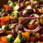 A comforting and nourishing salad featuring a vibrant blend of chickpeas, kidney beans, fresh vegetables, and herbs, perfect for any gathering.