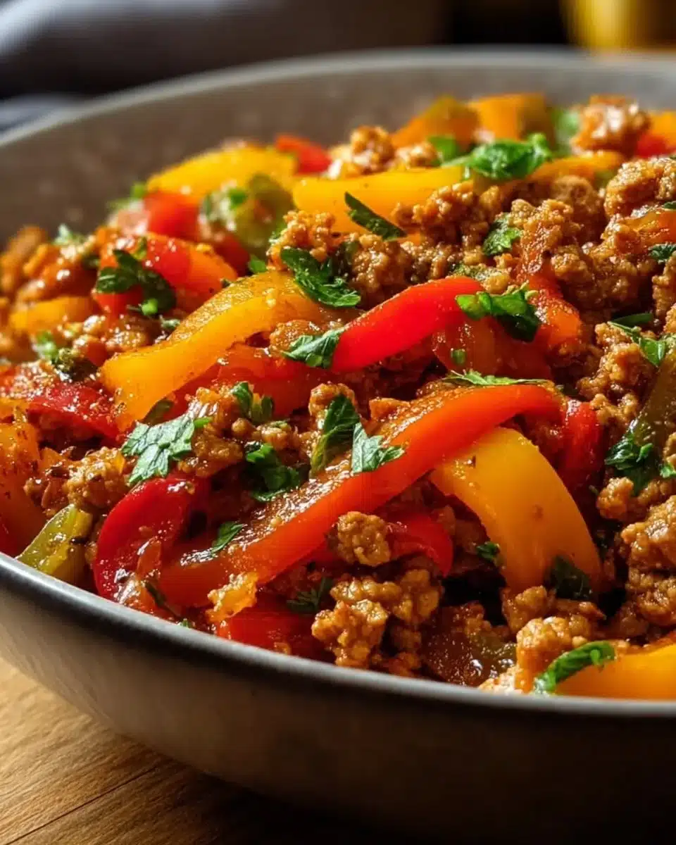 A simple and comforting dish combining ground turkey with vibrant bell peppers, flavored with spices and aromatics for a nourishing meal.