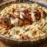 Finally, it’s time to plate our creation. Layer the Cajun rice beautifully on a plate, and place the sliced chicken gently on top. Drizzle that luscious creamy sauce over everything, letting it cascade like a gentle waterfall. Finish with a sprinkle of fresh parsley for a pop of color and freshness, adding a touch of nature to your meal.