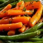 A delicious celebration dish featuring tender caramelized carrots and crunchy green beans, coated in a sweet honey glaze, perfect for family gatherings.