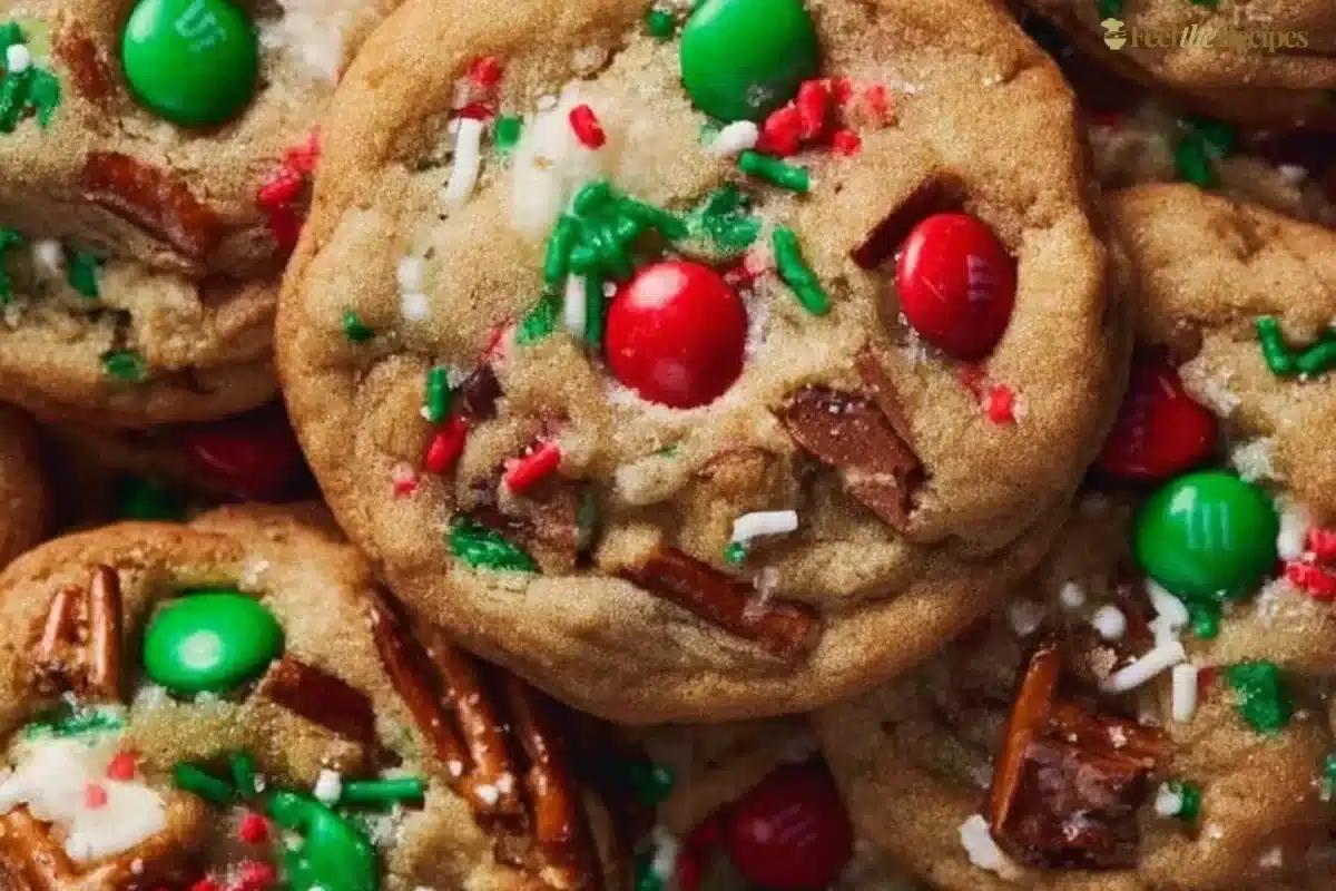 - It’s time to fold in all the fun mix-ins! Stir in the M&M’s, white chocolate chips, pretzel pieces, crushed potato chips, and holiday sprinkles. The dough will look festive and inviting, a true celebration of flavors.