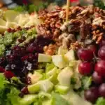 - In a large bowl, combine mixed greens, diced apples, celery, walnuts, dried cranberries, and grapes.