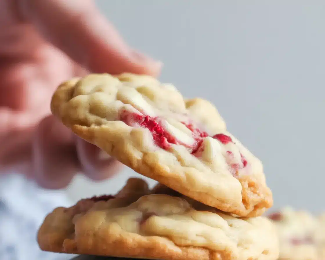 Shaping gives these cookies that bakery look without any fuss. Use a medium cookie scoop or 2 rounded tablespoons of dough per cookie. Roll into a ball with your hands, then stud the top with a couple of extra white chocolate chips and one or two raspberry pieces. That way the fruit peeks through after baking and looks as good as it tastes.