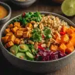 Hello, dear friend. Welcome to this sacred space where flavors dance and nourishment flows. Today, we will embark on a calming journey to create a Thai Peanut Sweet Potato Buddha Bowl. This bowl is more than just a meal; it’s a warm embrace for your body and soul. Imagine the vibrant colors of sweet potatoes, crisp vegetables, and a rich, creamy sauce blending harmoniously. It’s food that nurtures, comforts, and nourishes you deeply.